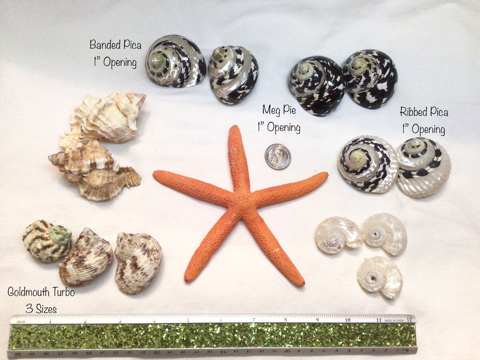 This listing is for ONE meg pie/pica shell. Any other props included in the photo are for decor. Sizes vary slightly from shell to shell. They are from nature. No two are alike.